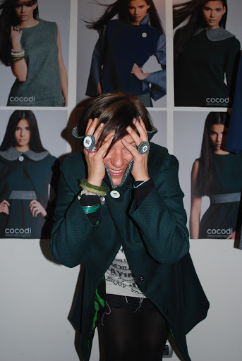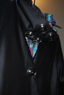 Debora Zavaglia indossa le sue creazioni. Il cappottino in lana ha il collo double!