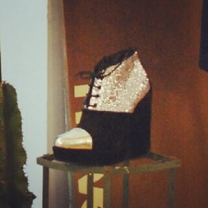 Pezzo forte della collezione: stringata con plateau e tacco alto. Punta dorata e inserto in lurex.