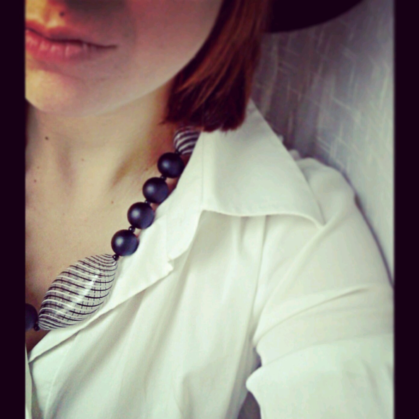 Camicia bianca per intenderci, sempre rassicurante, un cappello d’antan, nero e a tesa larga, ed un girocollo in cabochon di vetro, moderno e “handmade” come piace a me, ma con un valore aggiunto, sì perché mi era stato regalato da alcune carissime amiche ed è una creazione dell’atelier Salamandra di Torino.