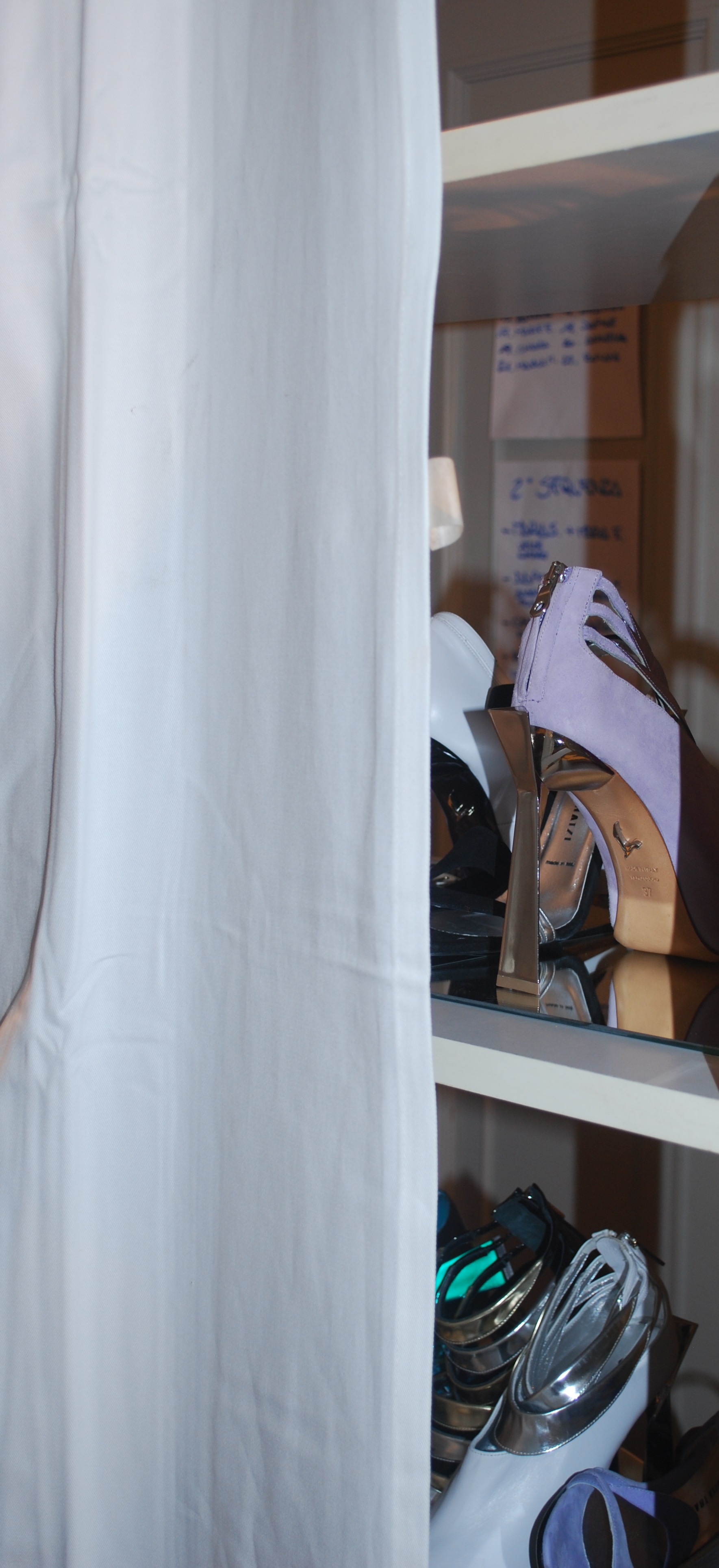 Le stringhe fasciano perfettamente il piede e rievocano, in modo stilizzato, le corolle dei fiori. Raffinato l’uso dei pellami pregiati, dalla pelle scamosciata al capretto verniciato a specchio, al crépe satin di seta, che piacevolmente si adattano alle linee taglienti e pulite dei tacchi scultorei.