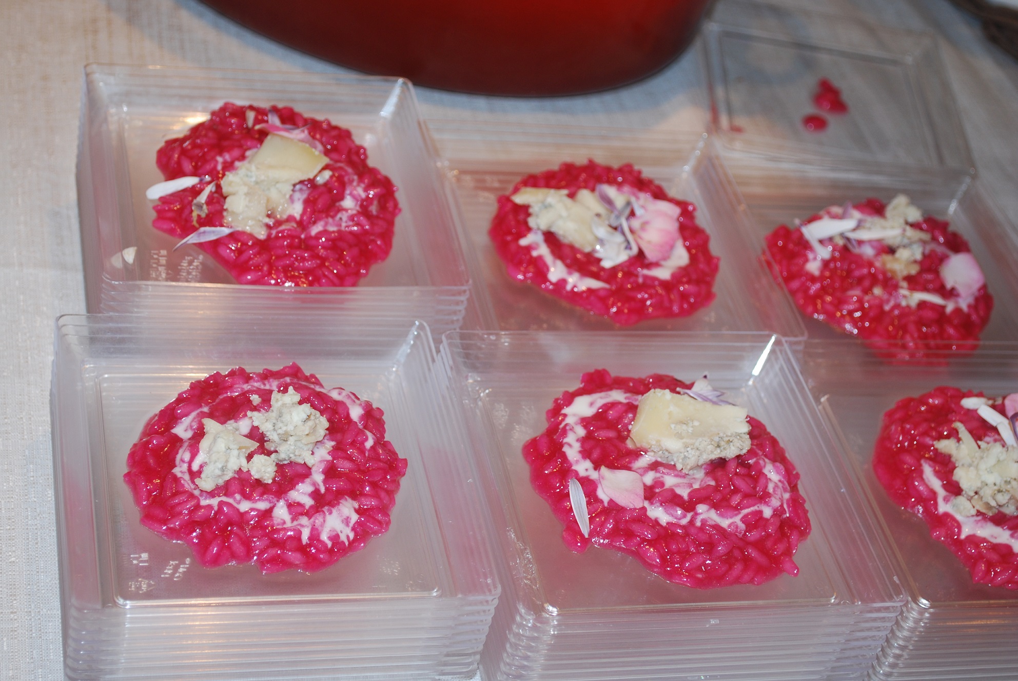Una serie di delizie in stile finger food, decorate con fiori edibili per rievocare i colori ed il tema della collezione, il piatto forte è stato sicuramente il risotto alla barbabietola!