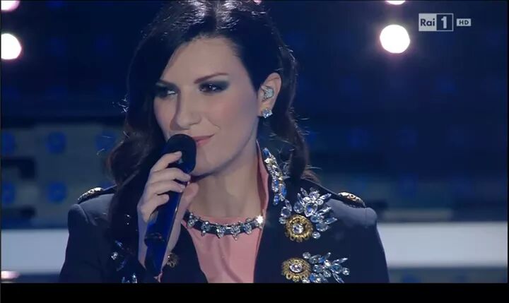 Non male i cabochon applicati sulla giacca di Laura Pausini, forse l’abito stile dea greca non la valorizza molto ma su di lei ho visto in passato outfit peggiori.
